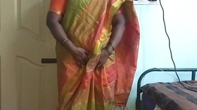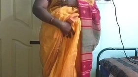 desi indian horny tamil telugu kannada malayalam hindi cheating wife vanitha wearing orange colour saree showing big boobs and shaved pussy press hard boobs press nip rubbing pussy masturbation
